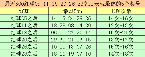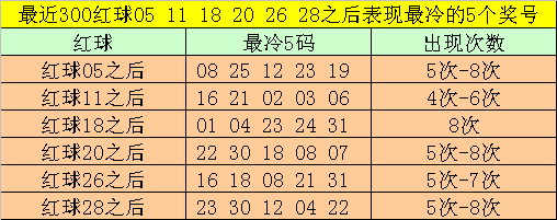 红球冷码统计:双色球第2023017期开出红球奖号分歧为:05、11、18、20、26、28,在最近300期开奖中,各号码出现之后其下期出现最少的5个红球分歧为: