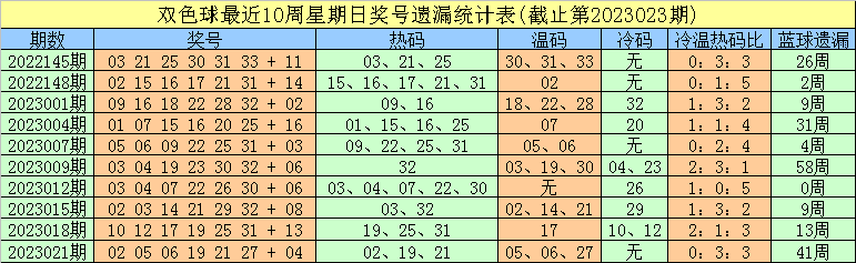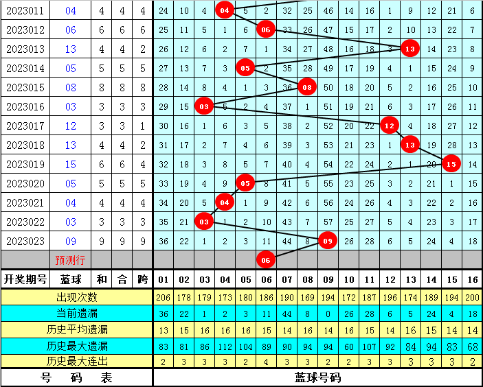 蓝球号码:最近30周日曜日蓝球冷温热码个数比为13:7:10,最近10周日曜日蓝球冷温热码个数比为5:2:3,本周日曜日蓝球瞻望开出热码,参考蓝球号码06。